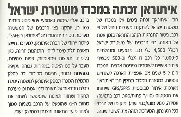 איתוראן זכתה במכרז משטרת ישראל Posted on 7 במרץ 201326 במאי 2025 by EladAdmin איתוראן זכתה במכרז משטרת ישראל פורסם על ידי: מגזין רכב ותחבורה הכתבה פורסמה בגליון 03/13 של המגזין רכב ותחבורה