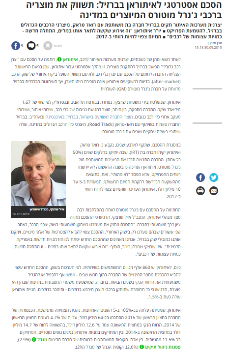הסכם אסטרטגי לאיתוראן בברזיל: תשווק את מוצריה ברכבי ג'נרל מוטורס המיוצרים במדינה – שוק ההון Posted on 30 בספטמבר 201526 במאי 2025 by EladAdmin הסכם אסטרטגי לאיתוראן בברזיל: תשווק את מוצריה ברכבי ג'נרל מוטורס המיוצרים במדינה – שוק ההון פורסם על ידי: דה מארקר פורסם באתר דה מארקר – בתאריך 30 בספטמבר 2015