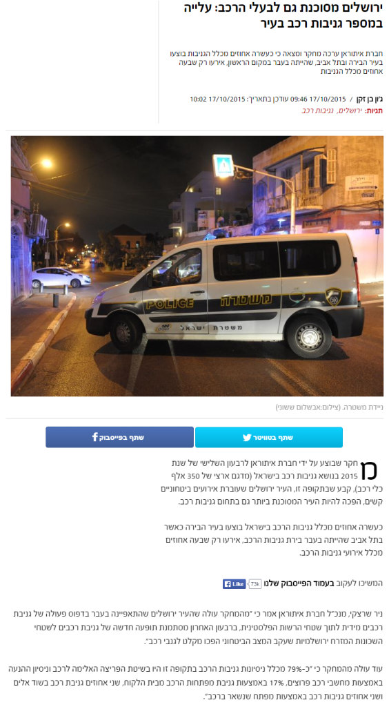 ירושלים מסוכנת גם לבעלי הרכב: עלייה במספר גניבות רכב בעיר Posted on 17 באוקטובר 201526 במאי 2025 by EladAdmin ירושלים מסוכנת גם לבעלי הרכב: עלייה במספר גניבות רכב בעיר פורסם על ידי: מעריב פורסם באתר מעריב – בתאריך 17 באוקטובר 2015