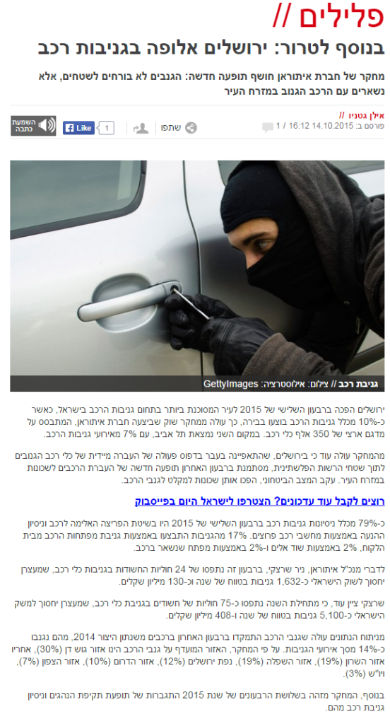 בנוסף לטרור: ירושלים אלופה בגניבות רכב Posted on 14 באוקטובר 201526 במאי 2025 by EladAdmin בנוסף לטרור: ירושלים אלופה בגניבות רכב פורסם על ידי: ישראל היום פורסם באתר ישראל היום – בתאריך 14 באוקטובר 2015