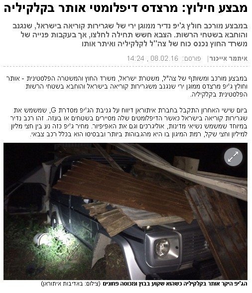 מבצע חילוץ: מרצדס דיפלומטי אותר בקלקיליה Posted on 8 בפברואר 201626 במאי 2025 by EladAdmin מבצע חילוץ: מרצדס דיפלומטי אותר בקלקיליה פורסם על ידי: YNET
