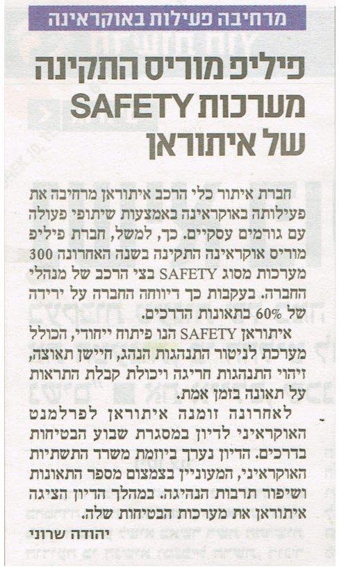 פיליפ מוריס התקינה מערכות SAFETY של איתוראן Posted on 24 ביולי 201626 במאי 2025 by EladAdmin פיליפ מוריס התקינה מערכות SAFETY של איתוראן פורסם על ידי: מעריב