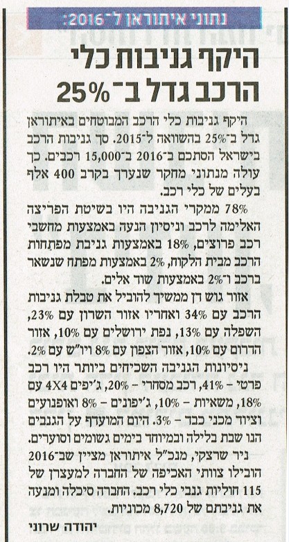 נתוני איתוראן ל-2016: היקף גניבות כלי הרכב גדל ב- 25% Posted on 4 בינואר 201726 במאי 2025 by EladAdmin נתוני איתוראן ל-2016: היקף גניבות כלי הרכב גדל ב- 25% פורסם על ידי: ידיעות אחרונות